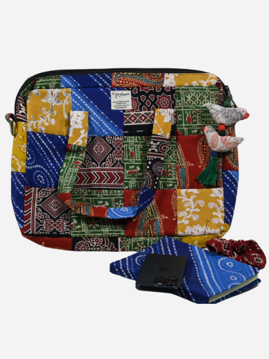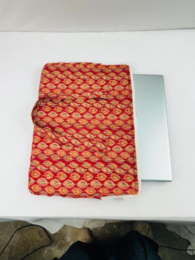 Sleek and minimal, this handcrafted laptop bag features soothing wave-like blue and green stripes on a soft cream base. Lightly padded for device protection and equipped with sturdy fabric handles, it’s ideal for everyday work, travel, or study use. A perfect blend of elegance, tradition, and utility.