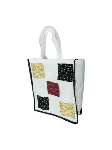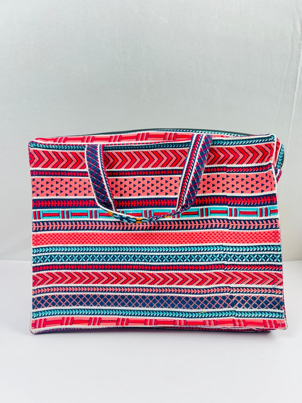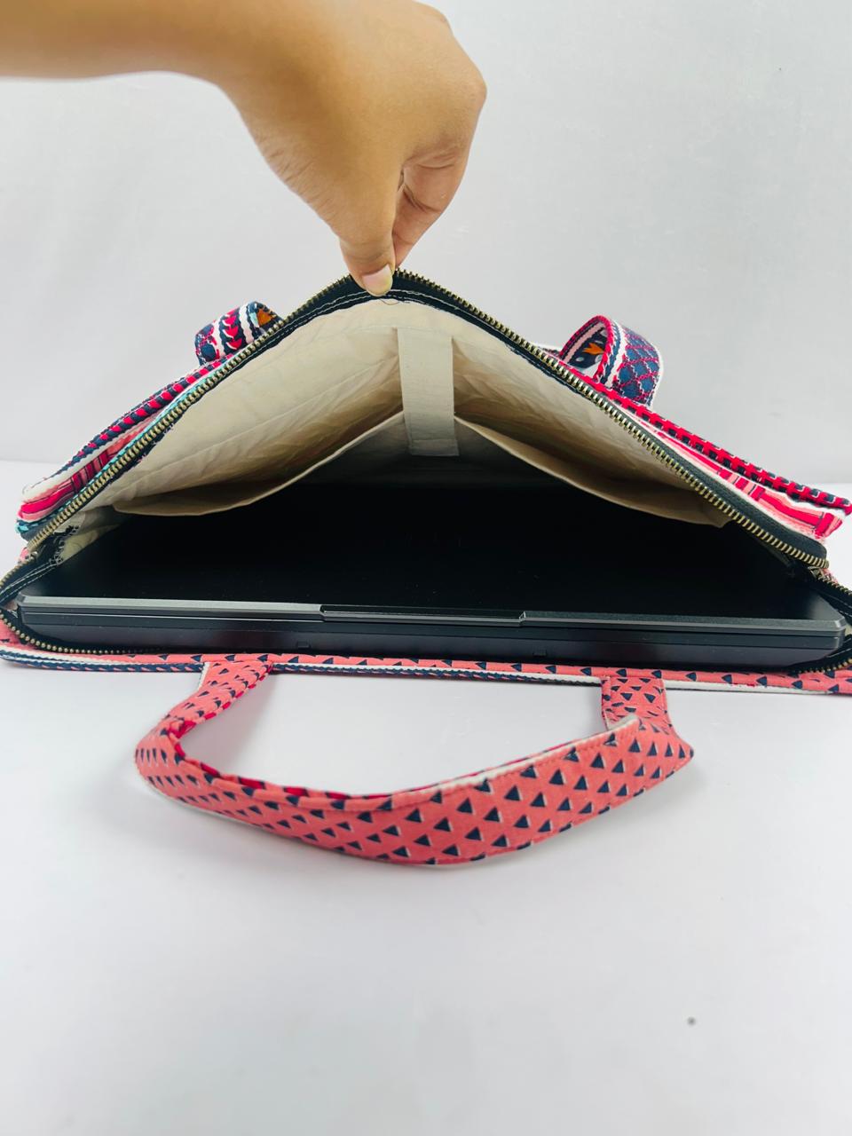 Make a style statement with this charming quilted laptop bag in a refreshing green base adorned with pink floral block prints. Featuring sturdy handles, a front zipper pocket, and Sample space inside, this bag perfectly balances traditional aesthetics with modern utility. Ideal for office, college, or creative professionals on the go.
